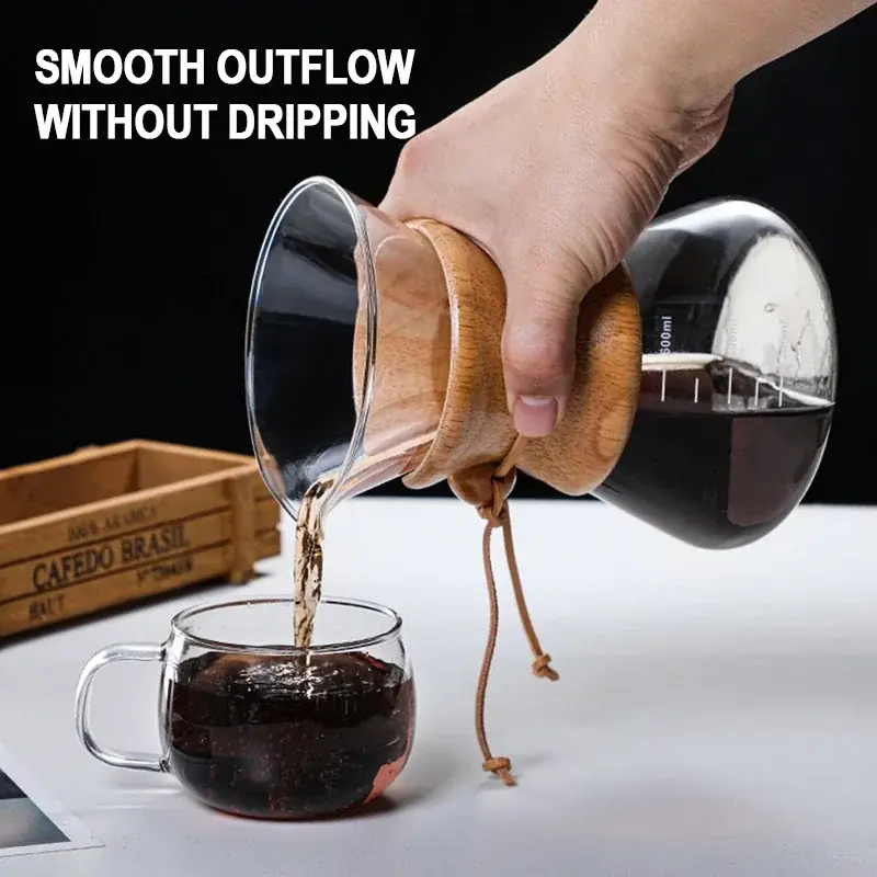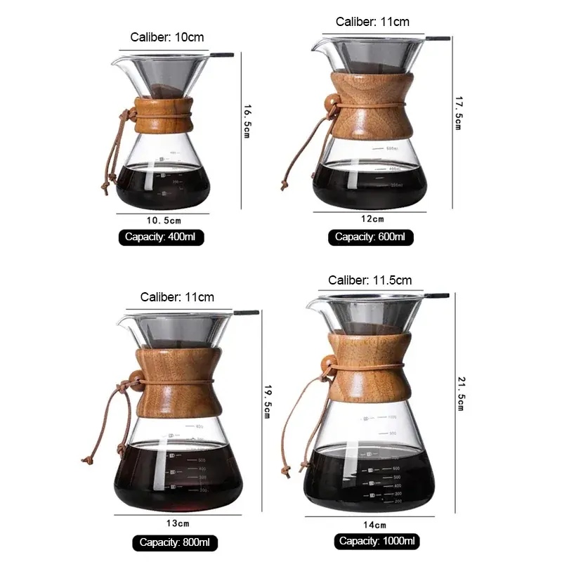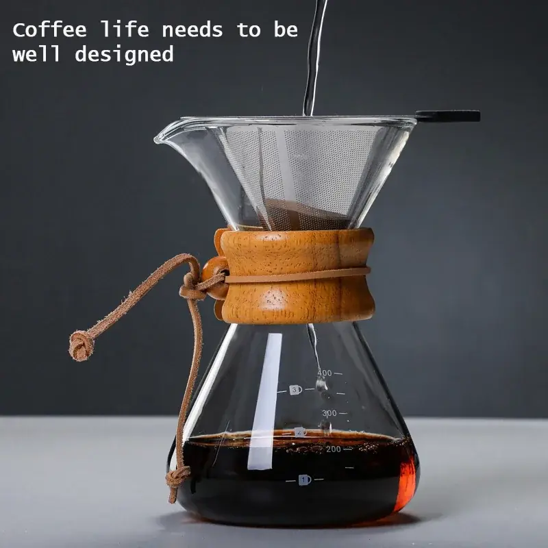 إبريق تحضير قهوة يدوية زجاجي شفاف من زجاج بوروسيليكات مع فلتر ستانلس ستيل، مثالي لتحضير القهوة المختصة بأسلوب الـ Pour Over.
