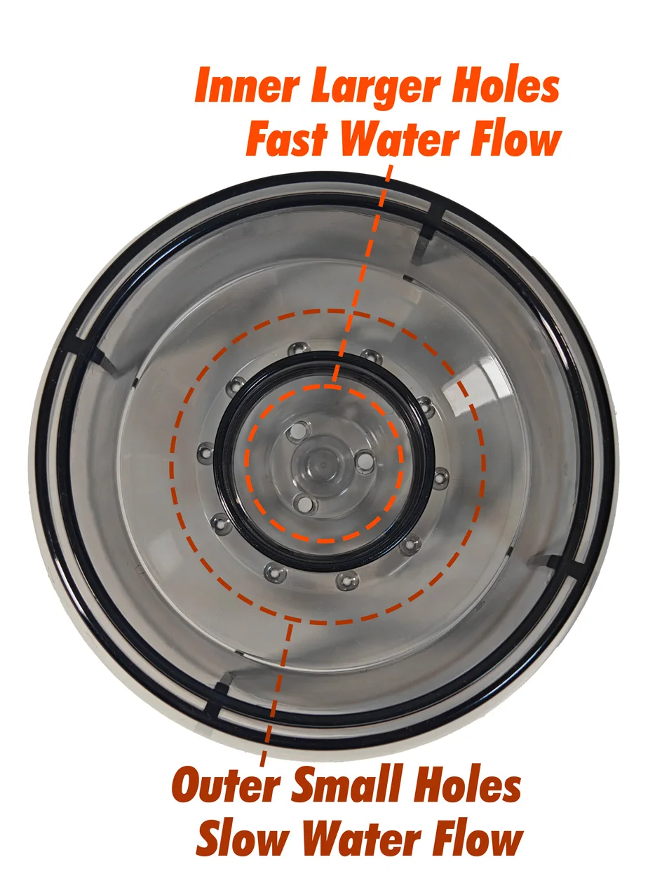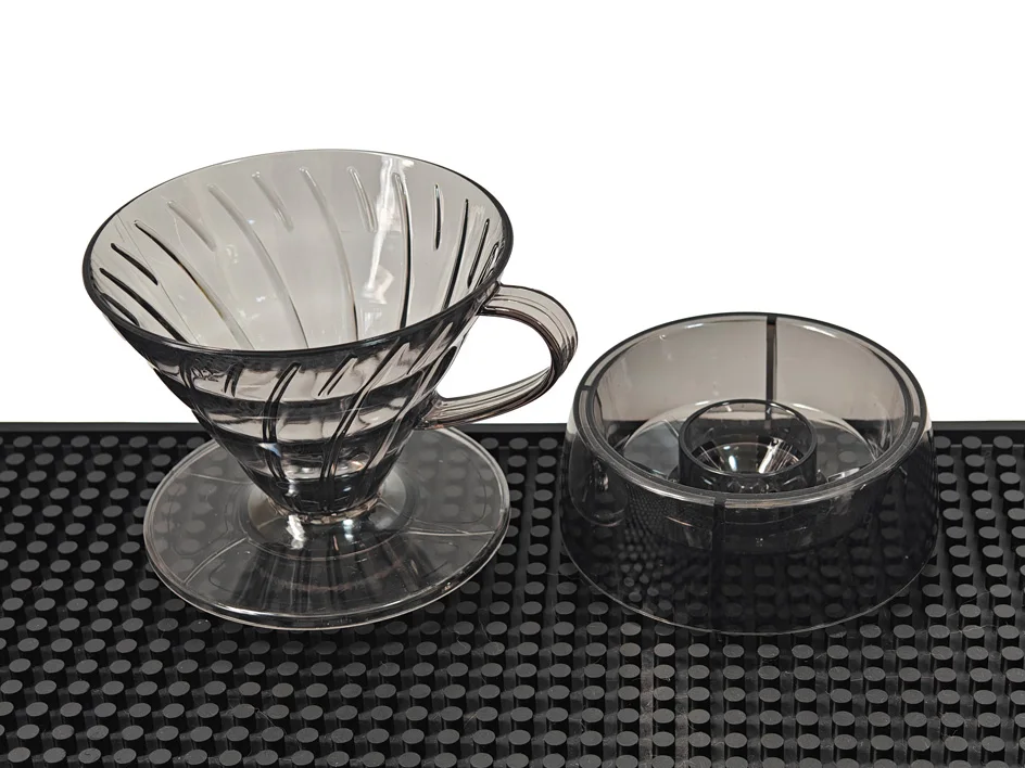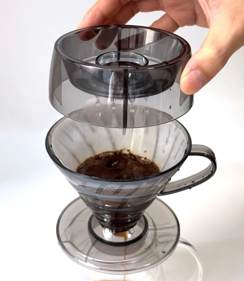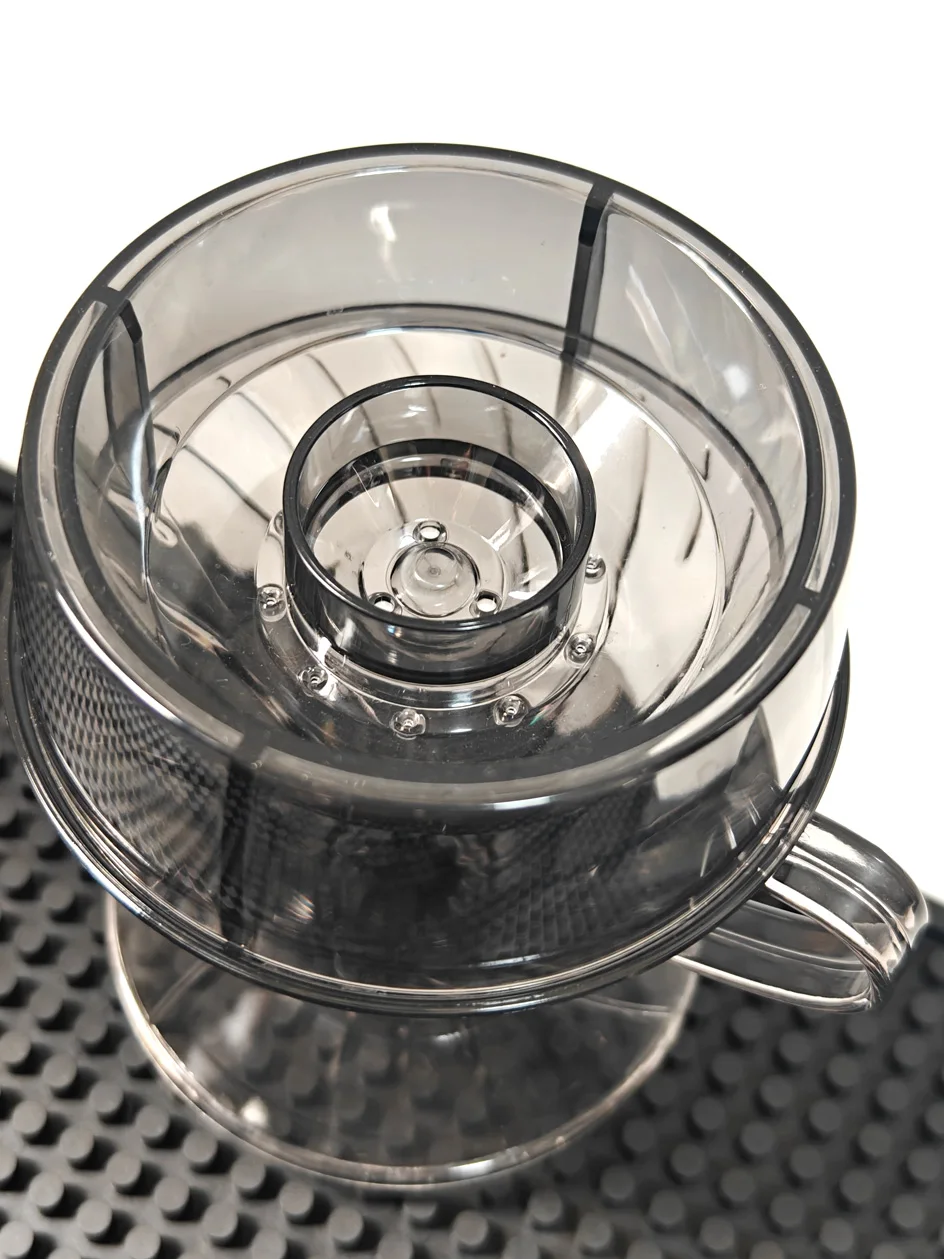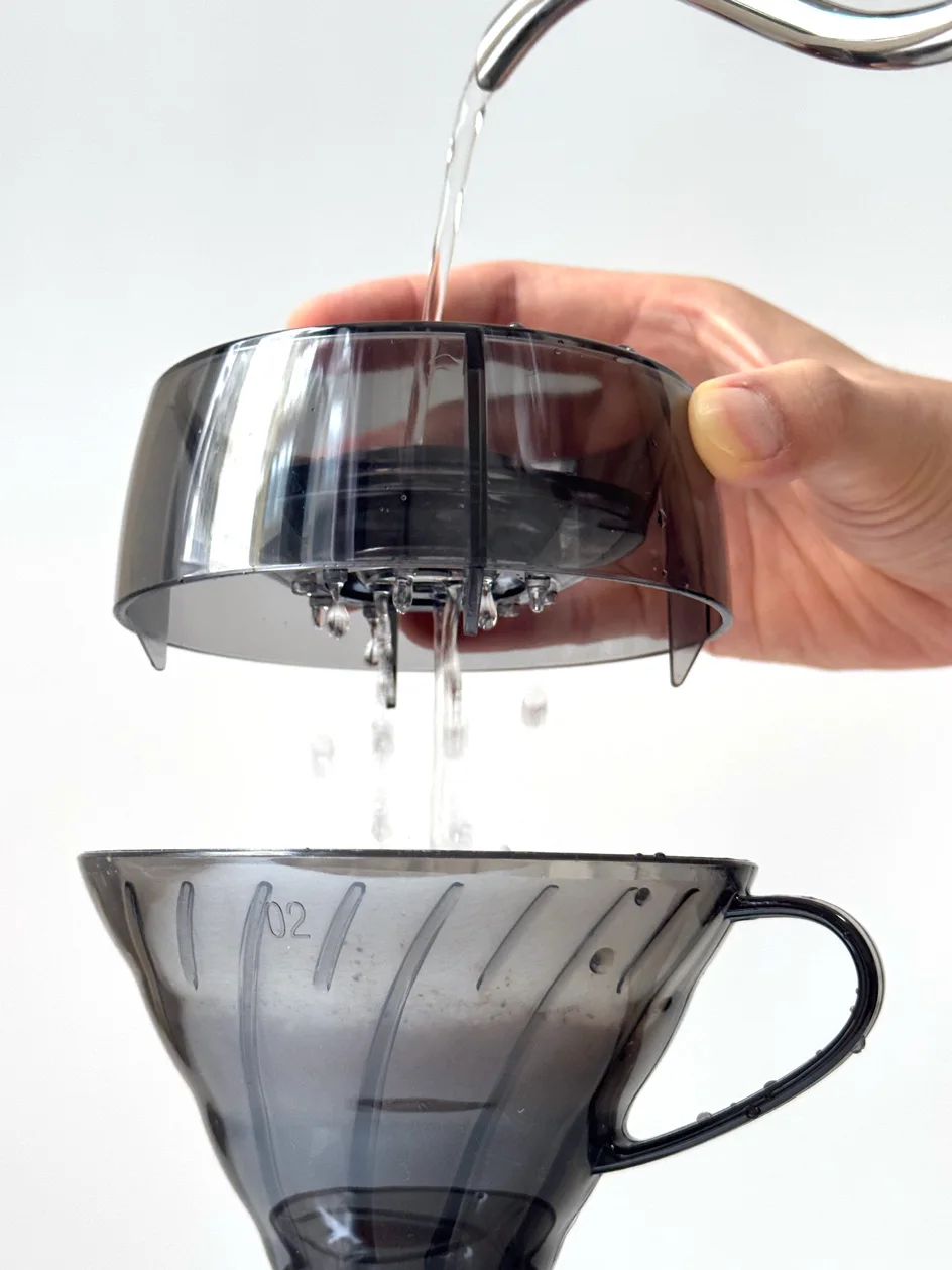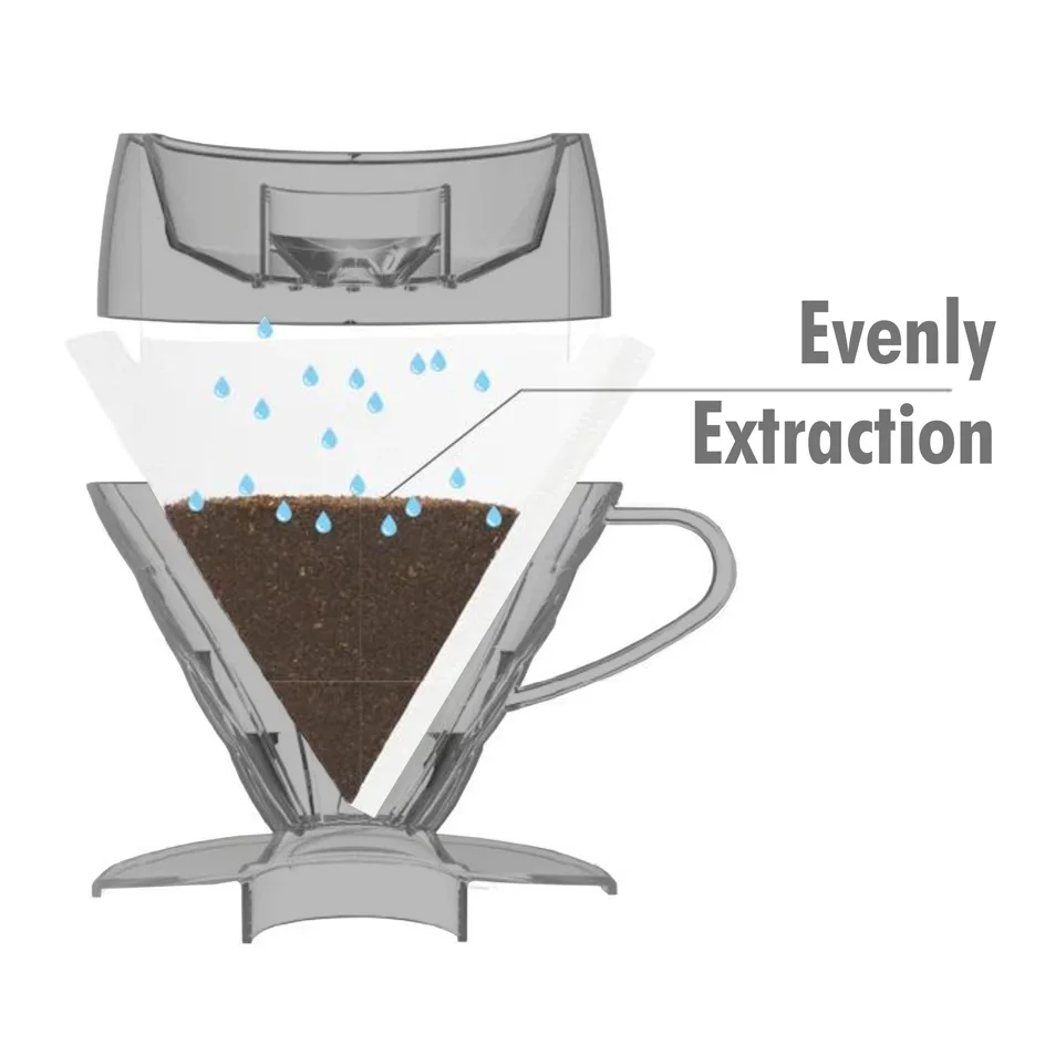 تقنية Drip Shower (موزع المياه): يأتي القمع مزوداً بغطاء توزيع فريد يعمل على رش المياه بالتساوي على سطح القهوة، مما يمنع حدوث القنوات (Channeling) ويضمن استخلاصاً متجانساً لكل حبات البن.
