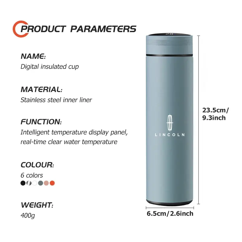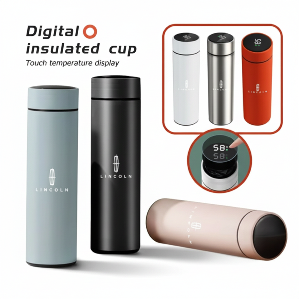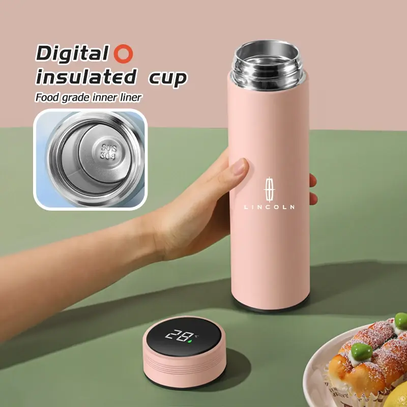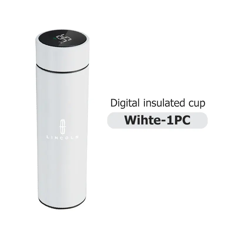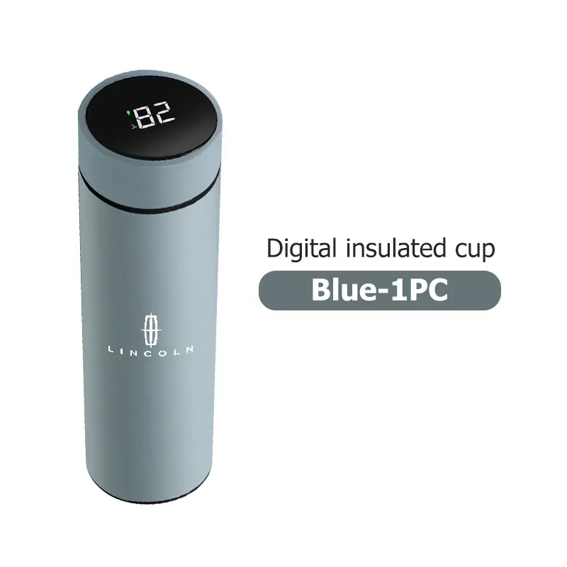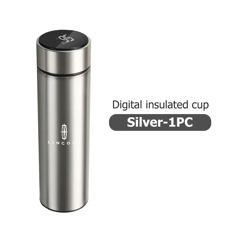 كوب ذكي حراري للسيارة مع شاشة عرض درجة الحرارة، مصنوع من زجاج حراري وفولاذ مقاوم للصدأ، يحافظ على حرارة أو برودة المشروبات، تصميم عملي متوافق مع سيارات لينكولن.