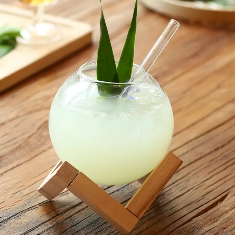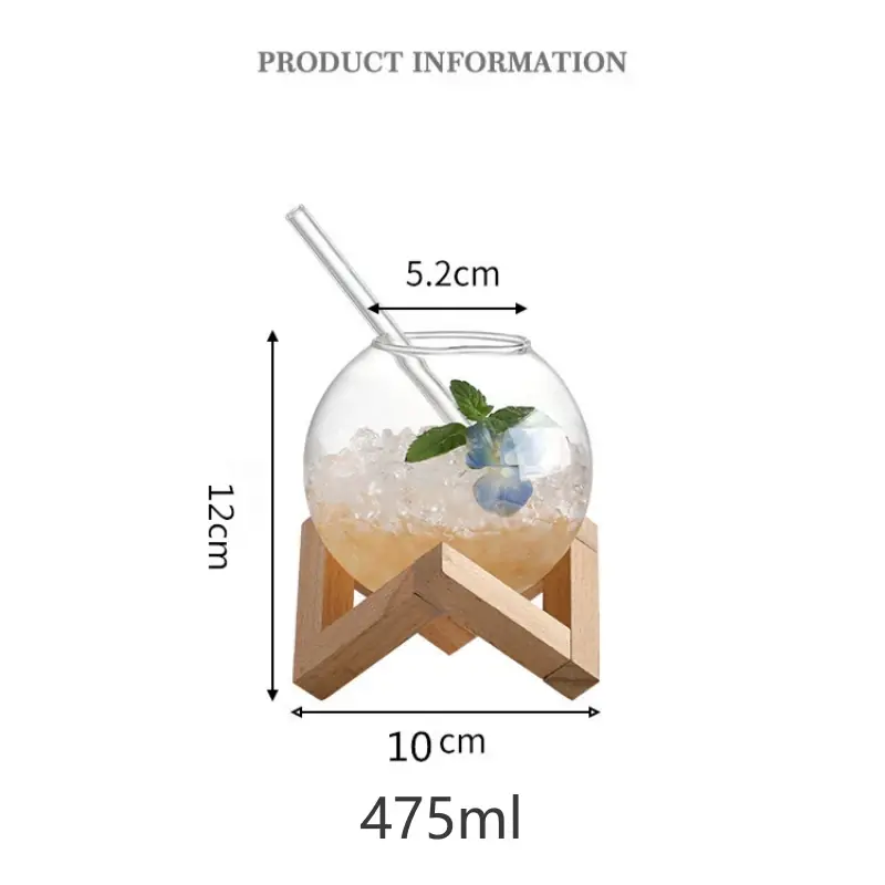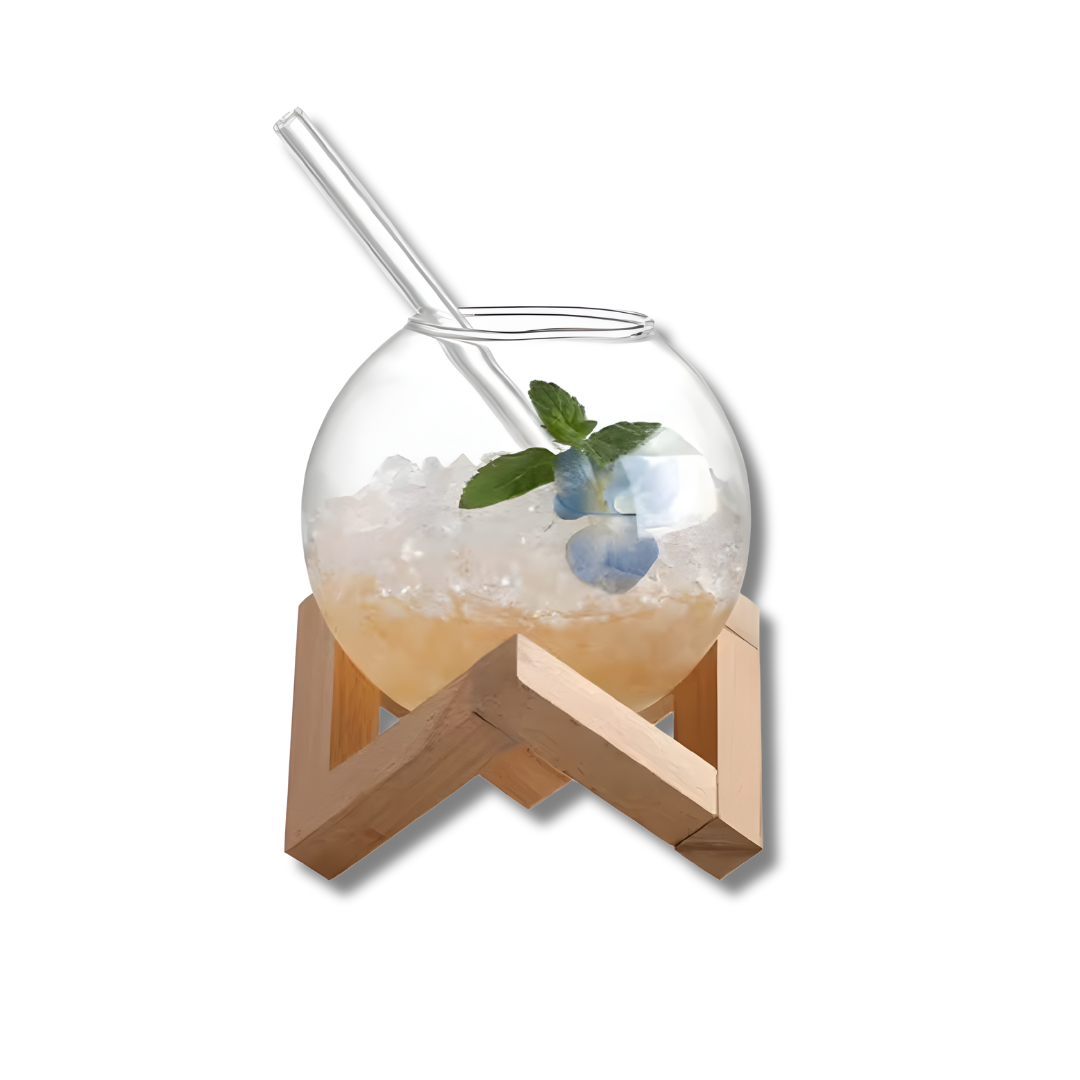 كوب زجاجي كروي إبداعي مع حامل خشبي وقشة، مثالي لتقديم العصائر، القهوة الباردة، الكوكتيلات والمشروبات الصيفية بطريقة أنيقة ومبتكرة.
