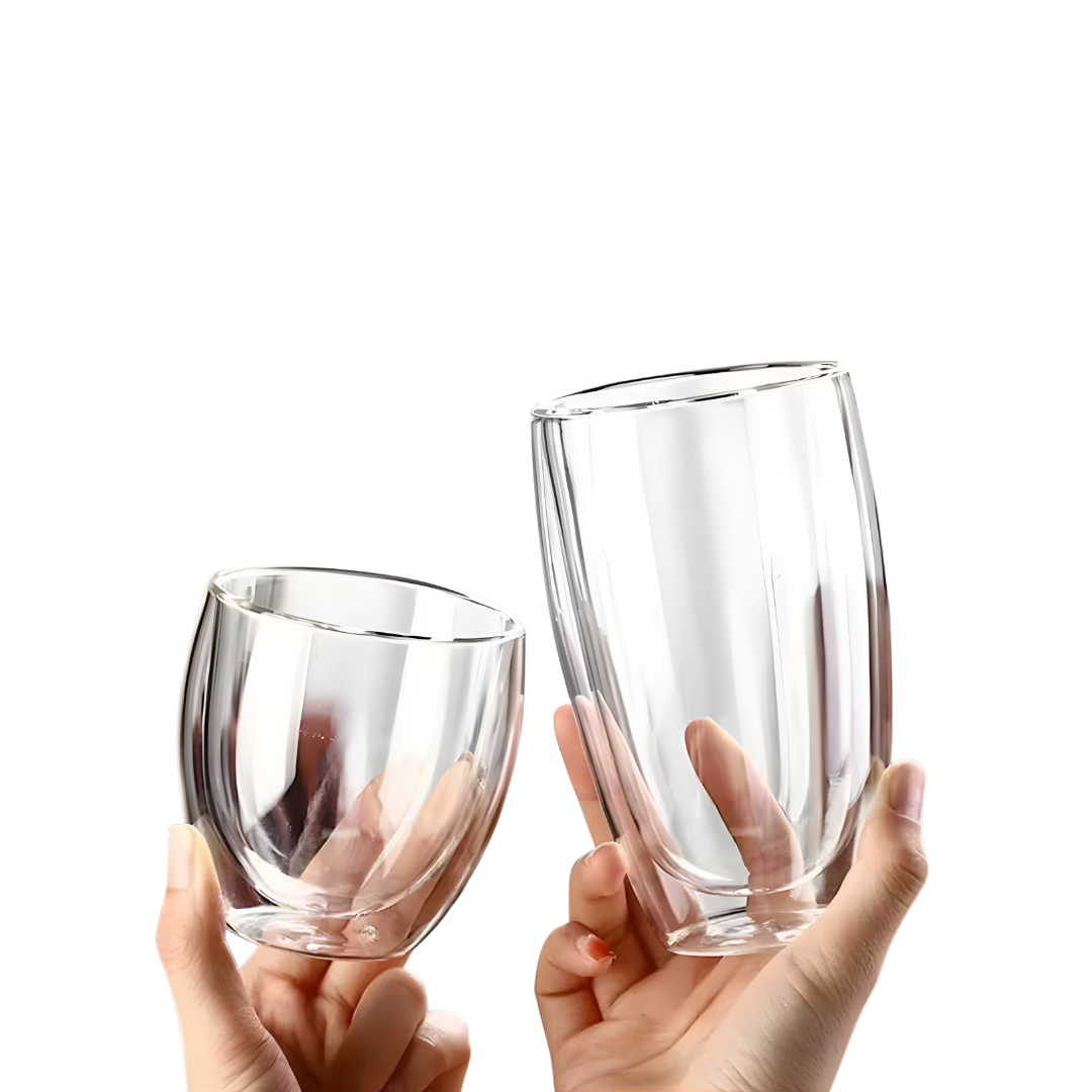 كوب زجاجي مزدوج الجدار بسعة 250–450مل، مقاوم للحرارة، مثالي للقهوة أو المشروبات الساخنة والباردة مع تصميم أنيق وعصري للاستخدام اليومي.