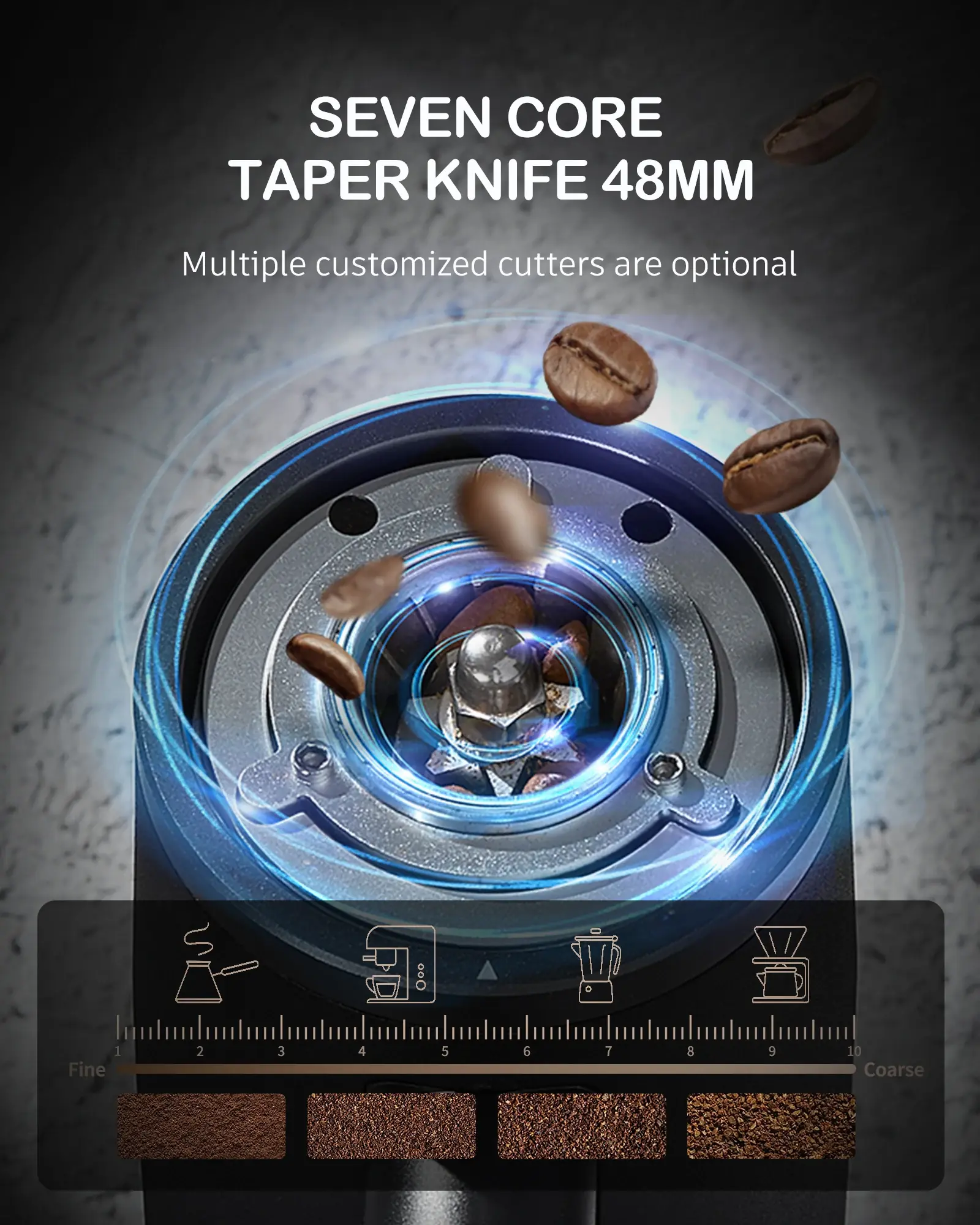 • ضبط طحن بدون خطوات Stepless: يسمح بتحكم كامل بحجم الطحن لأي طريقة تحضير، من الإسبريسو إلى القهوة المقطرة.